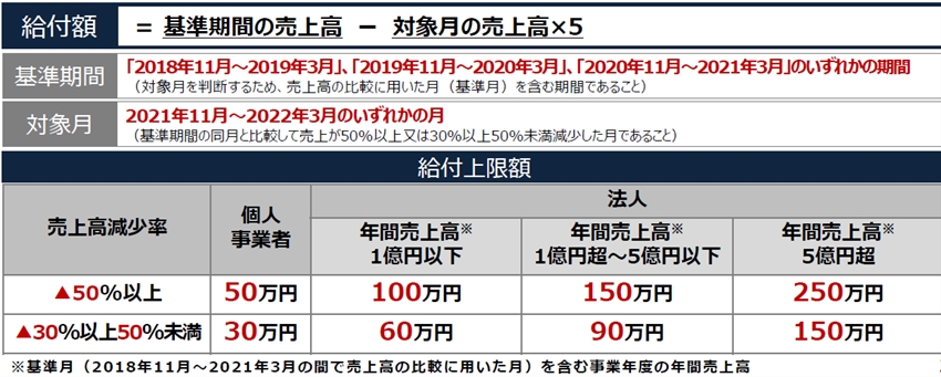 給付額は、売上高減少率及び年間売上高(法人の場合)で判定され、個人では30万円または50万円、法人は60万円~250万円が上限となります。