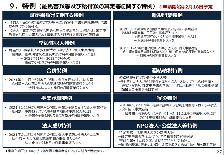 なお、今回は確定申告書等の証拠書類を提出できない事業者や、新規開業などで定められた期間での比較計算ができないなどの場合等についても「特例」措置ということで申請が可能になる場合があります。