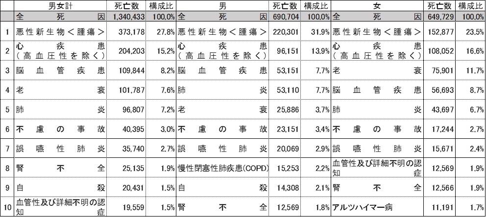 「老衰」については、2016年の92,806人→101,787人(8,981人増加)で、天寿を全うして亡くなる人が増えてきていることがわかります。男女計では第4位の死因ですが、女性では第3位の死因(11.7%で1割以上の人)となっており、この勢いで増加していくと、男女計でも近いうちに第3位の死因となっていくでしょう。