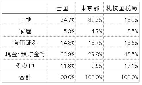 相続財産の構成比では、札幌国税局管内は「土地」の割合が低く、「現金・預貯金等」の割合が高いことが特徴的です。道内の土地価額が割安なことが、課税対象者の割合が低い要因と考えられます。
