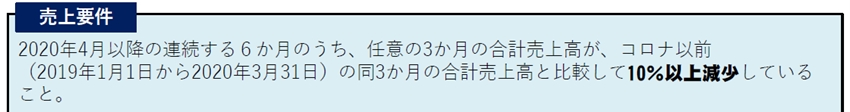 売上要件は次の通りで、コロナ以後で売上が減少した事業者が対象となります。