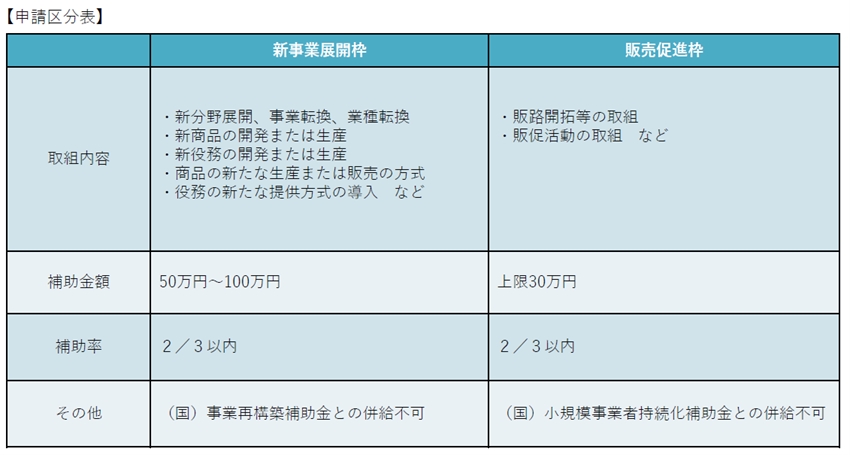 「新事業展開枠」と「販売促進枠」の2つの枠があり、どちらかを選択して申請します。