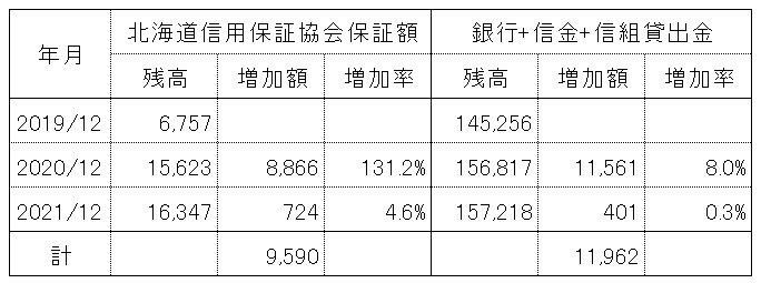 「北海道信用保証協会」の保証残高をみてみますと、この2年間で9,590億円の大幅増加で、2021年12月期の残高は、2019年12月期残高の2.4倍の数字に達しています。