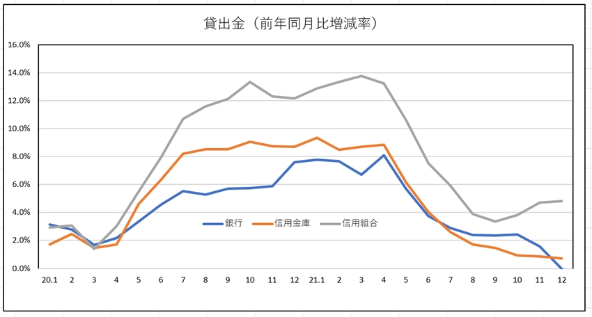 2020年1月以降の月別推移を見ますと、2020年5月以降急激な伸びを示しており、2021年5月まで高い水準で推移しています。信組においては10%を超える高い伸びが続きました。