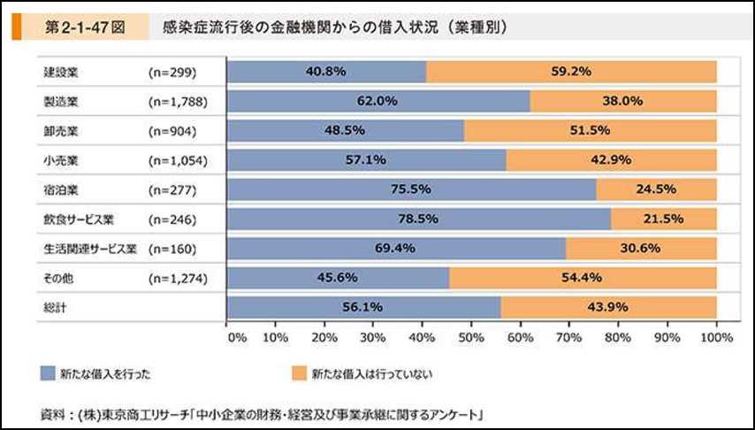「2021年中小企業白書」によると、調査対象企業のうち半数以上の56.1%がコロナ後に「新たな借り入れを行った」と回答しています。特に割合が高いのが、「宿泊業」「飲食サービス業」で、どちらも4分の3以上の企業が借入を行っています。
