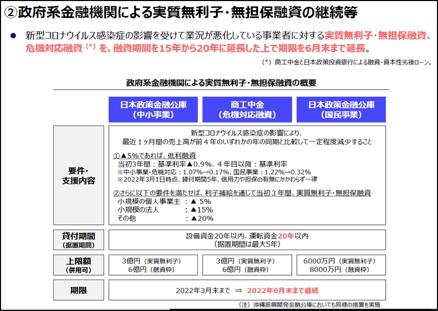 ② 政府系金融機関による実質無利子・無担保融資の継続等